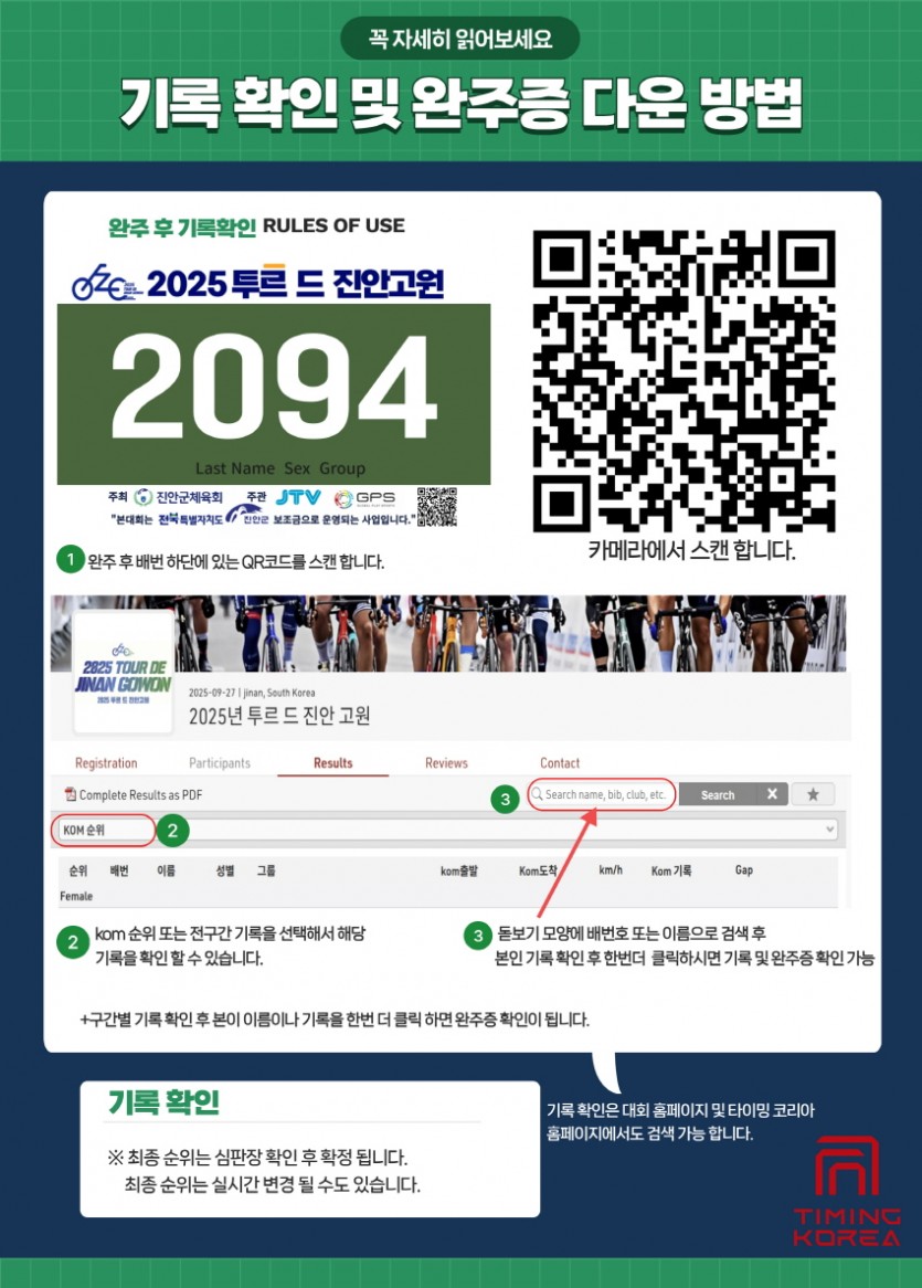 기록확인 및 완주증 다운방법 페이지 정보 작성자 최고관리자 (tongkn@hanmail.net) 댓글 0건 조회 134회 작성일 25-09-29 17:52 본문 기록확인 및 완주증 다운은 아래 링크로 확인 부탁드립니다.2025년 투르 드 진안 고원, 2025-09-27 : : my.race|result 이전글대회 불참하신 분들 기념품 발송 25.10.02 다음글[공지] 2025 투르 드 진안고원 대회 전체기록지 25.09.29 목록